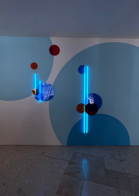 La instalación funciona como un juego constructivo de líneas, formas y volúmenes, donde la luz y el color reestructuran el espacio y lo convierten en un entorno dinámico y relacional.