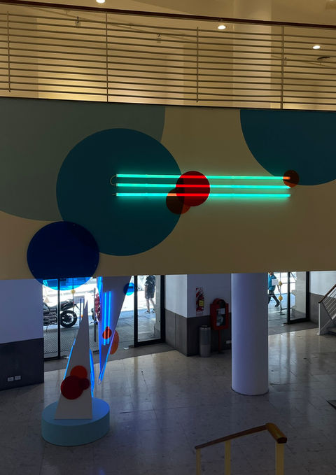 También fue fundamental que desde el exterior se perciba el uso de filtros cromáticos, presentes tanto en los acrílicos semitransparentes de la instalación como en los vinilos aplicados sobre los vidrios. De este modo, la obra no se limita al espacio interior, sino que se proyecta visualmente hacia la calle, extendiendo su presencia y su campo perceptivo.