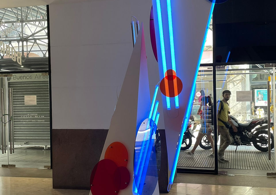 Luz Constructiva es una instalación espacial que se expande a lo largo de todo el sector de ingreso del Centro Cultural Borges. Es una obra específicamente desarrollada para ese espacio, donde cada elemento funciona como parte de una composición geométrica integral.